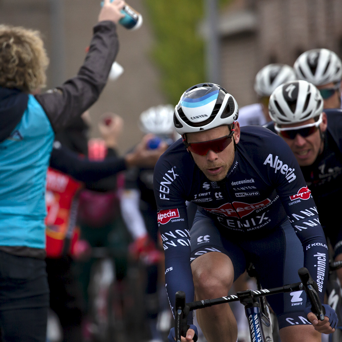 Ronde van Vlaanderen 2025 - Ceriel Desal is handed a very sticky gel by his team car on the climb