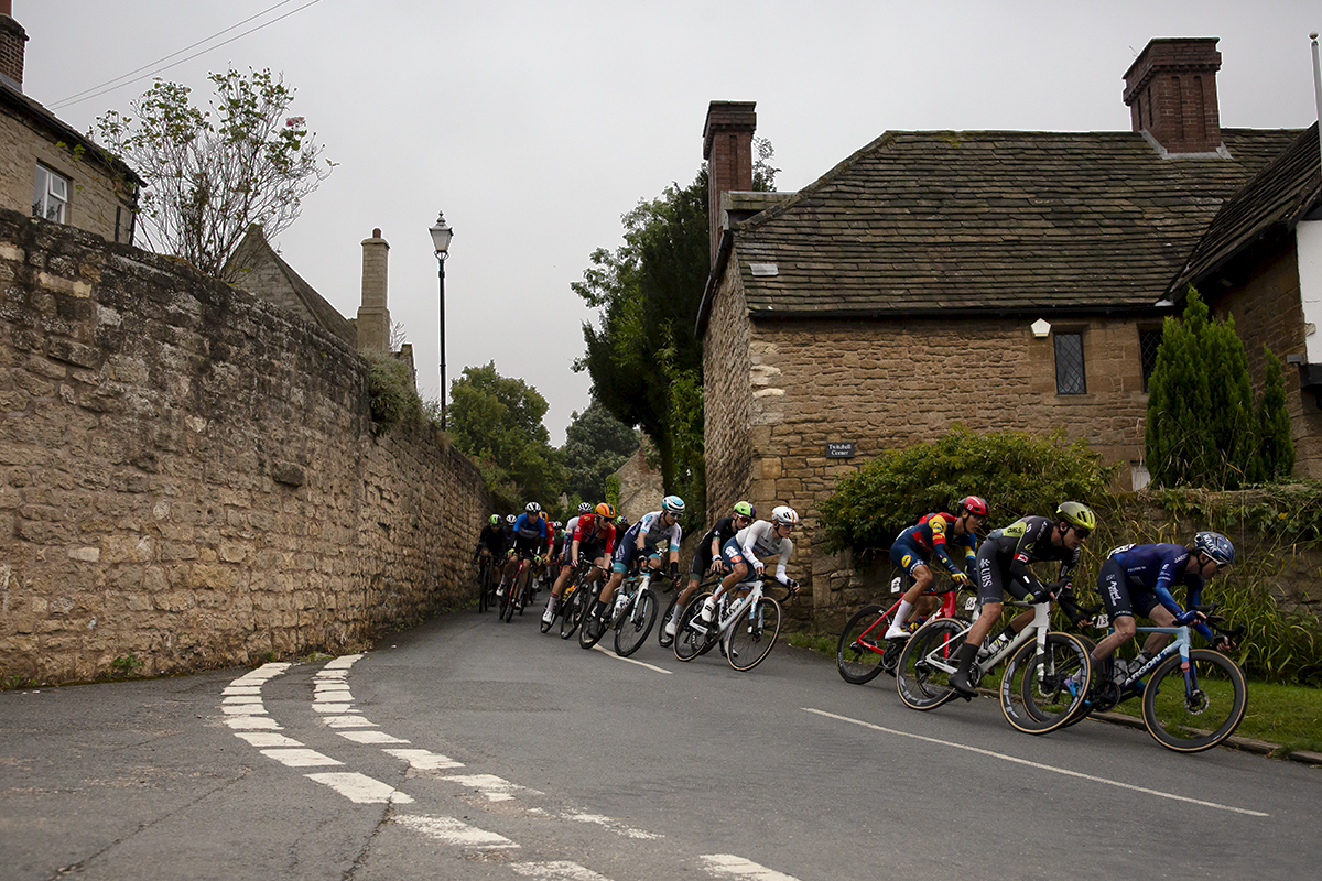 Tour of Britain 2025 - The peloton passes in front of a white cottage in Bildeston