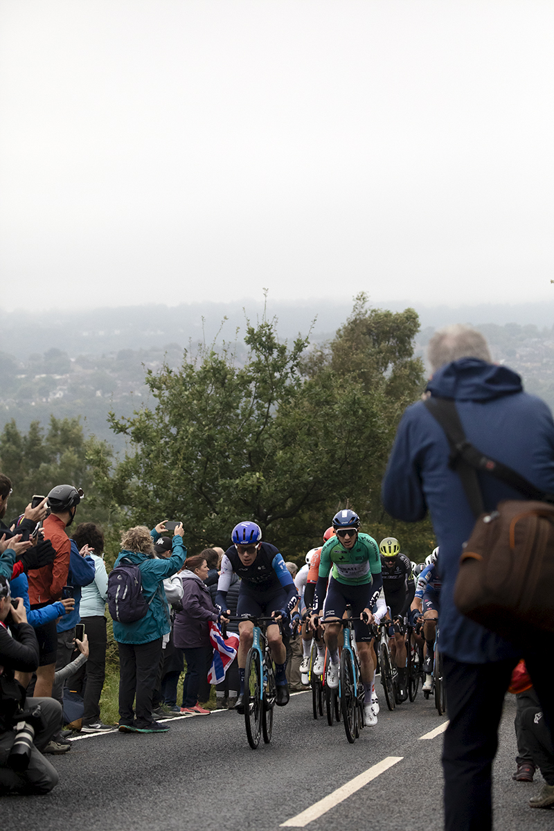 Tour of Britain 2025 - A view of the peloton from behind as it leaves Stowmarket