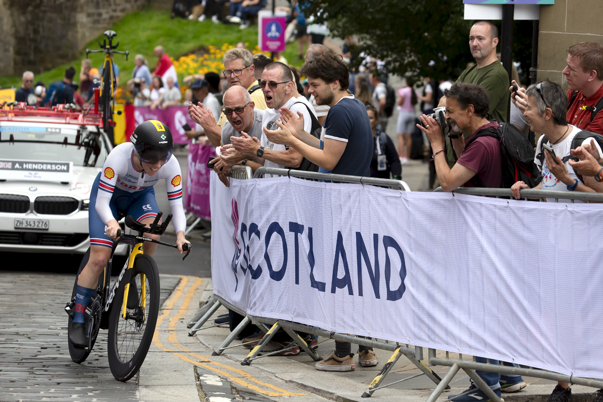 2023 UCI Cycling World Championships - Time Trial - Elite Women - Anna Henderson of Great Britain is cheered by fans as she approaches the cobbled section