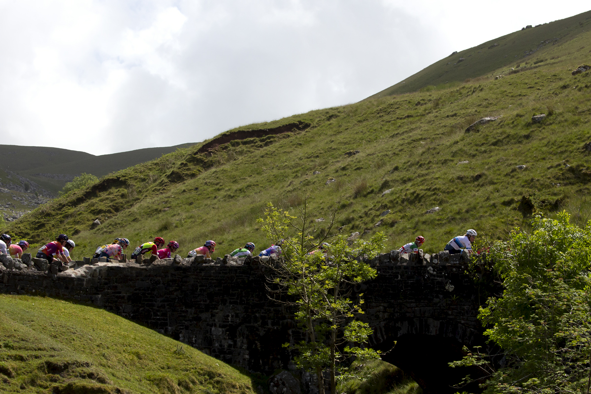 Women’s Tour 2022 - Riders cross a stone bridge over a brook on their way up the Black Mountain